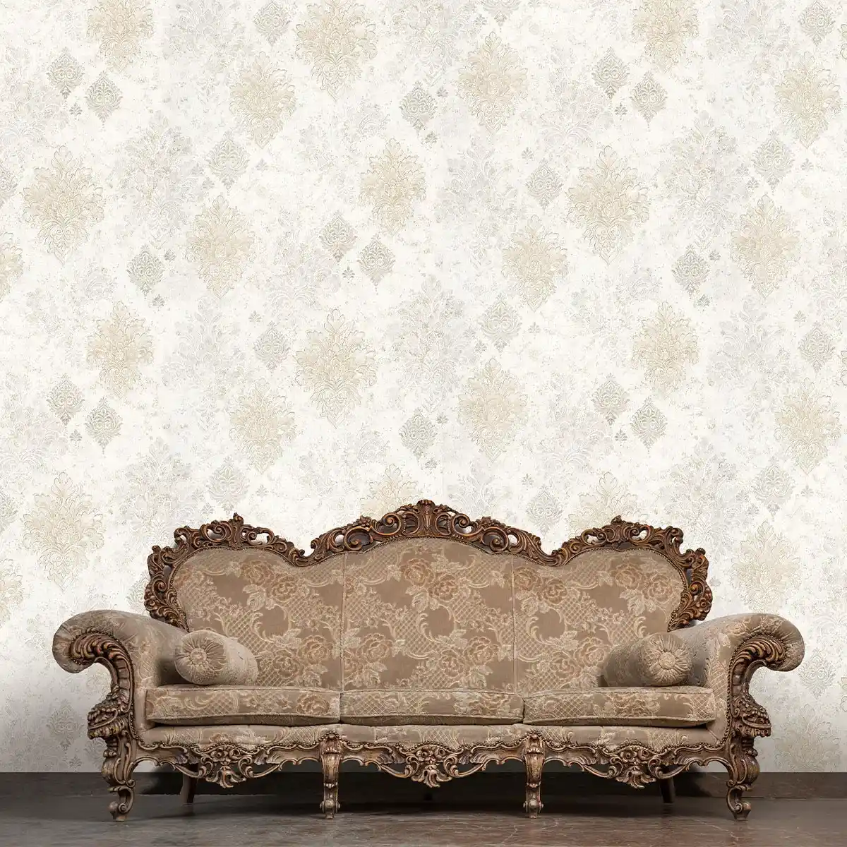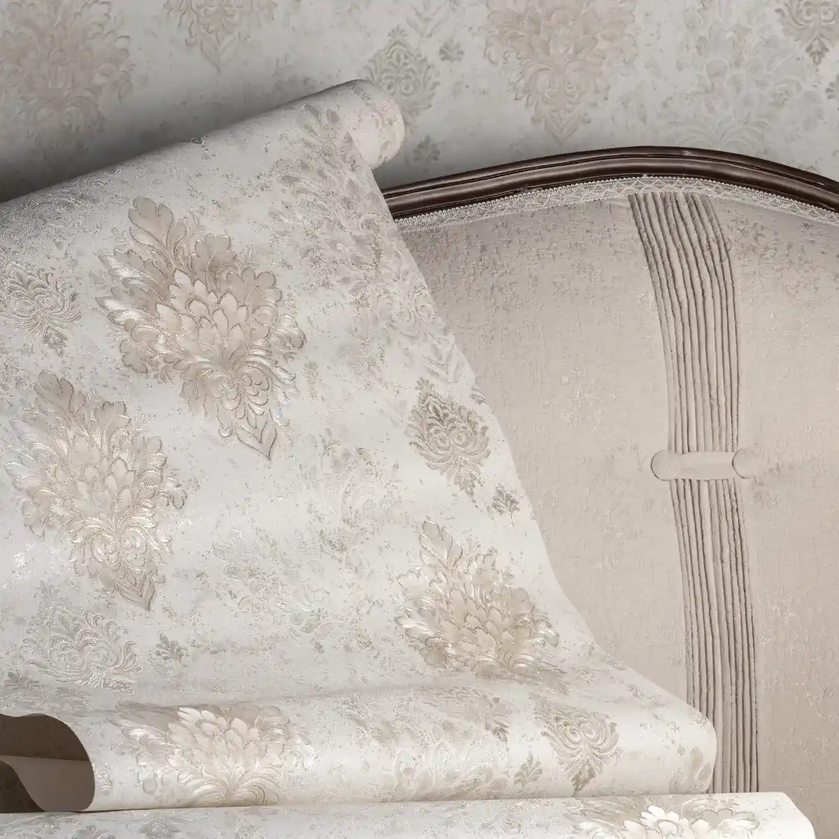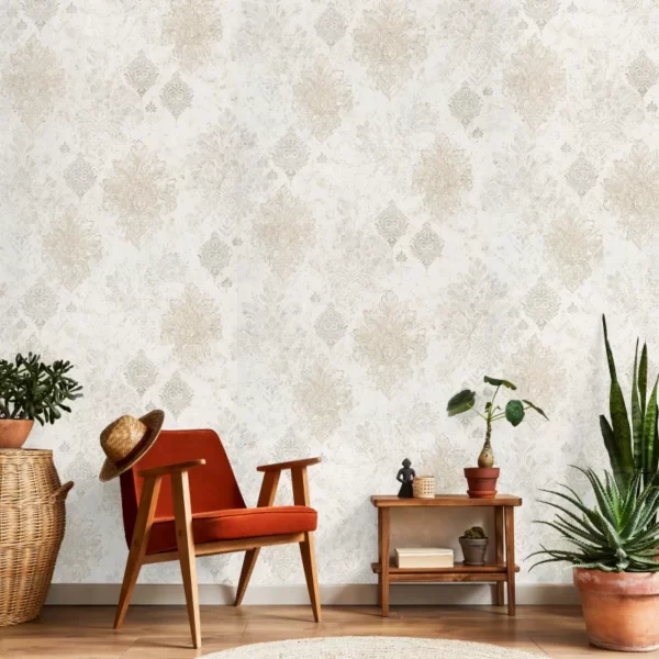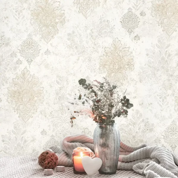 طرح این کاغذ دیواری همان طور که از نام آن پیداست، به صورت داماسک و پتینه است.