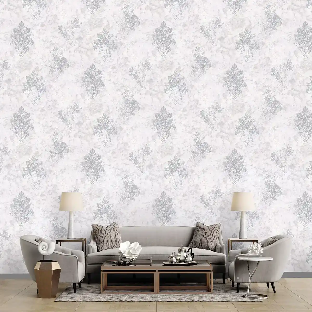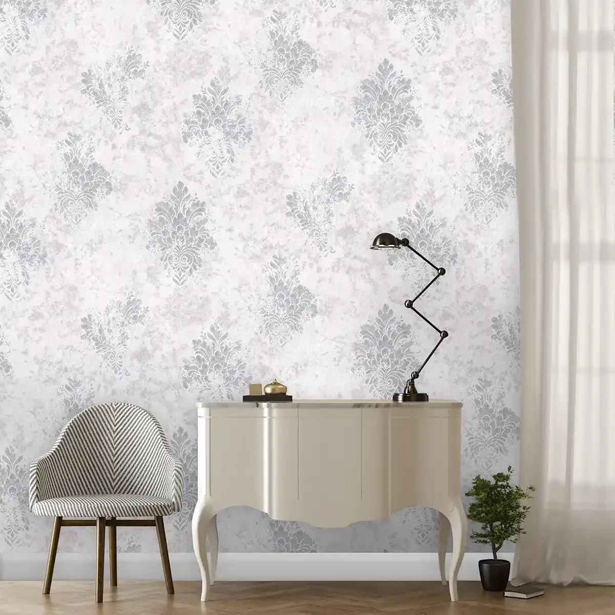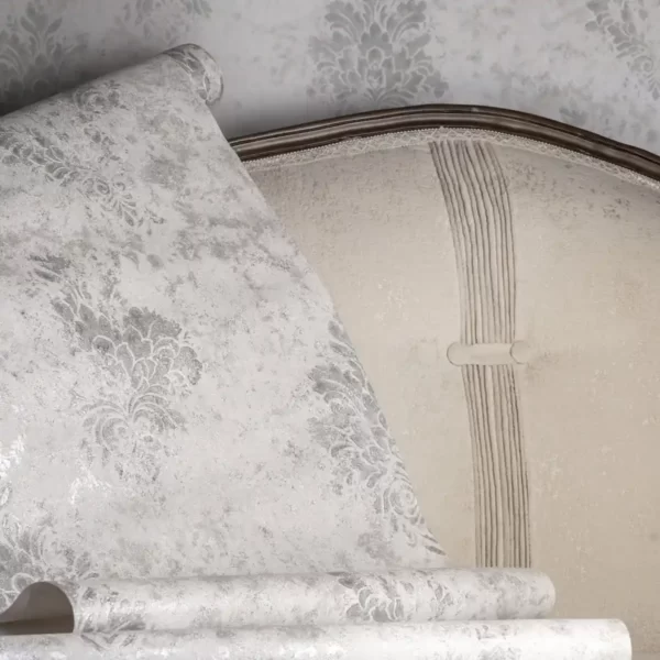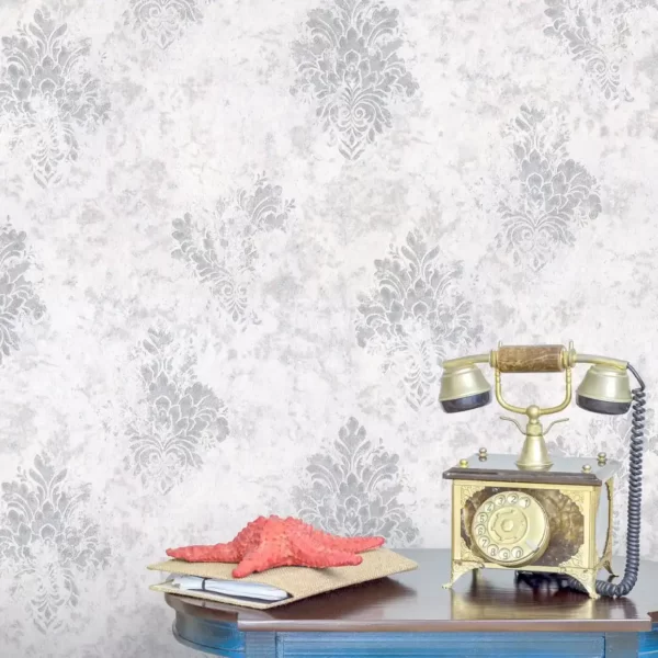 طرح این کاغذ دیواری همان طور که از نام آن پیداست، به صورت داماسک و پتینه است.
