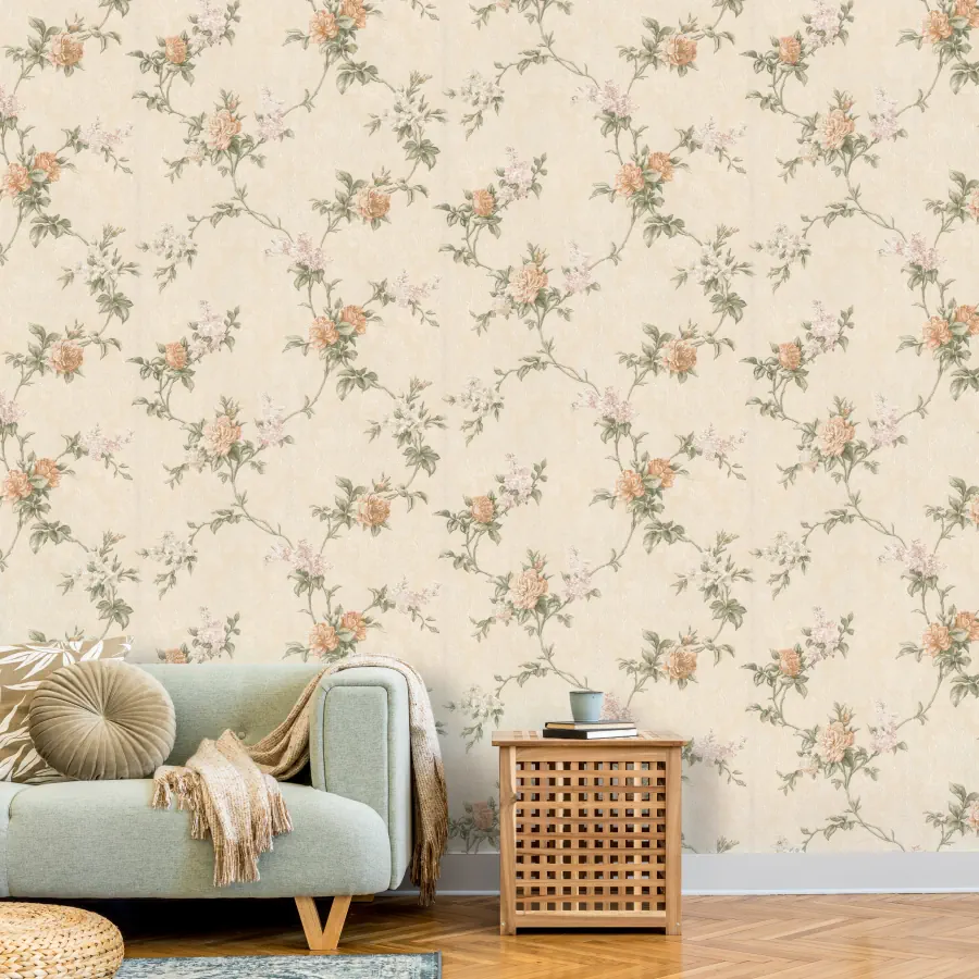 طرح این کاغذ دیواری همان طور که از نام آن پیداست، به صورت گلدار و نقش و نگار و رونده است.
